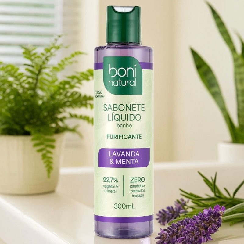 Coloque na mão ou numa esponja o Sabonete Líquido Banho Boni Natural Lavanda e Menta, espalhando por todo o corpo. Enxague em seguida. Uso diário.